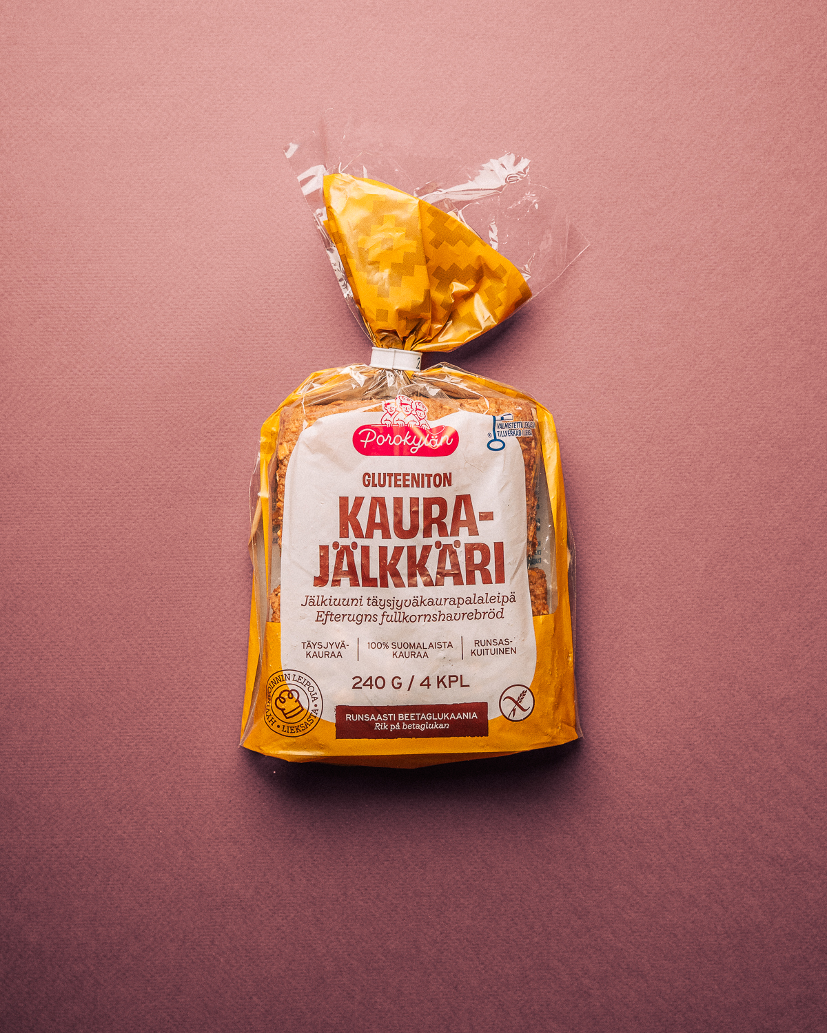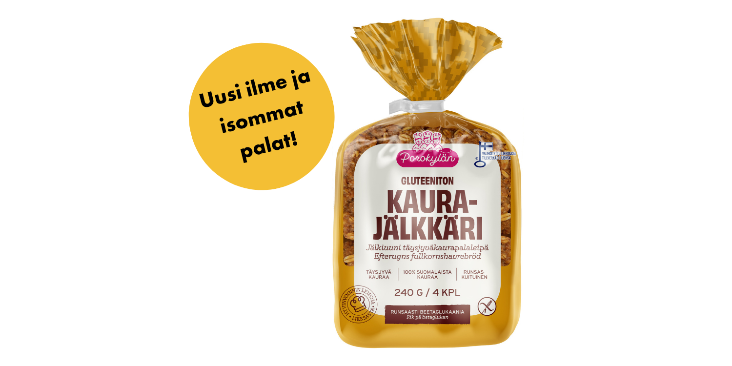Kaurajälkkäri on leivottu 100 % suomalaisesta täysjyväkaurasta, ja se sisältää luonnostaan runsaasti kauran betaglukaani – vesiliukoista kuitua, jolla on tutkitusti terveyttä edistäviä vaikutuksia. Reilusti kuitua ja suutuntumaa nyt isommassa palakoossa.